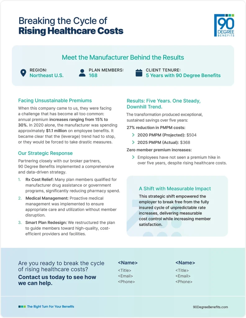 Discover how 90 Degree Benefits helped a Northeast manufacturer reduce projected costs by 27% PMPM and hold employee premiums flat for five years.